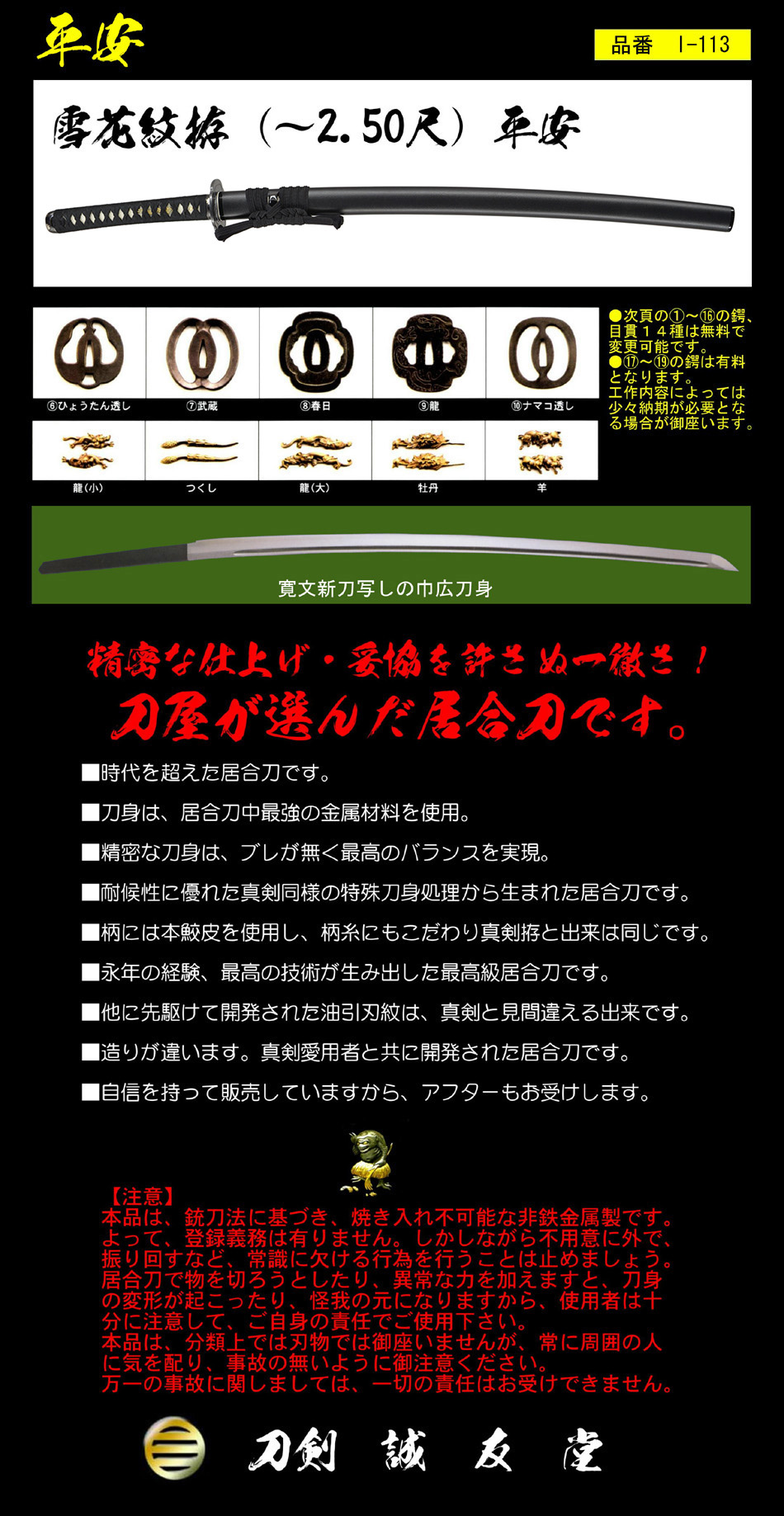 平安は最上の手持ちの良さが自慢の御刀です。縁頭は雪花紋銀象嵌で使い込むほどに味わいが出る良い金具です。刀身は巾広にして寛文新刀を写したもので刃紋は湾刃にしました。渋さで勝負です。単なる練習刀=居合刀の概念を捨て飾っても楽しめる御刀を目指して造りました。刀身の長さ、柄糸の色、鍔、目貫、と多種の中から御選びいただいてセミオーダーできます。