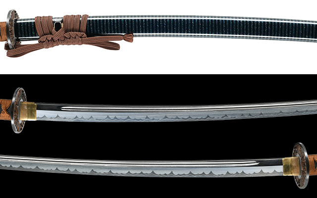 縁頭:鉄地銀象嵌 鍔:春日鍔 柄巻:正絹黒捻巻 本鮫皮 鞘塗:黒石目塗 目貫:ムカデ 下緒:正絹黒笹浪織 刀身:超強化金属、湾刃紋仕上 刀長:~2尺5寸まで5分刻みで調整します。刀身重量:~1000g